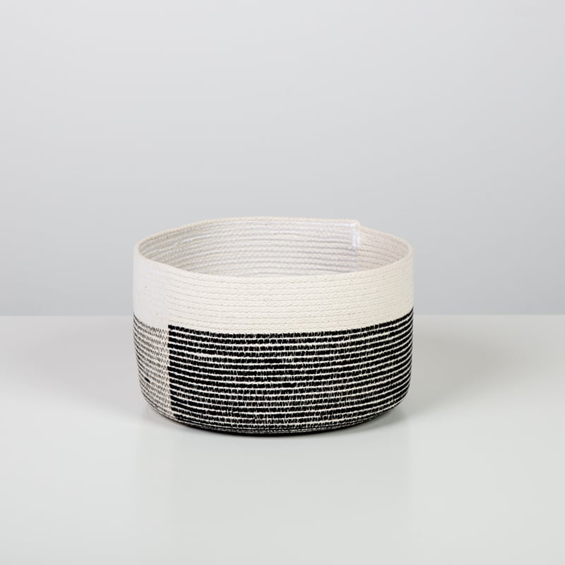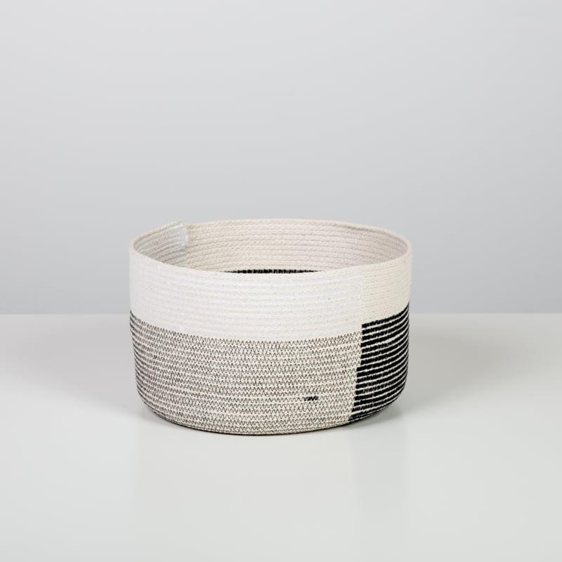 The Two-Block basket is one of the latest in a series of baskets utilizing the density of the stitching to create embroidery-like designs on the basket surface. It's made from #6 100% cotton cord that is coiled and stitched with sewing thread. The resulting textile is flexible but stiff enough to hold its shape. Available in colorways shown.